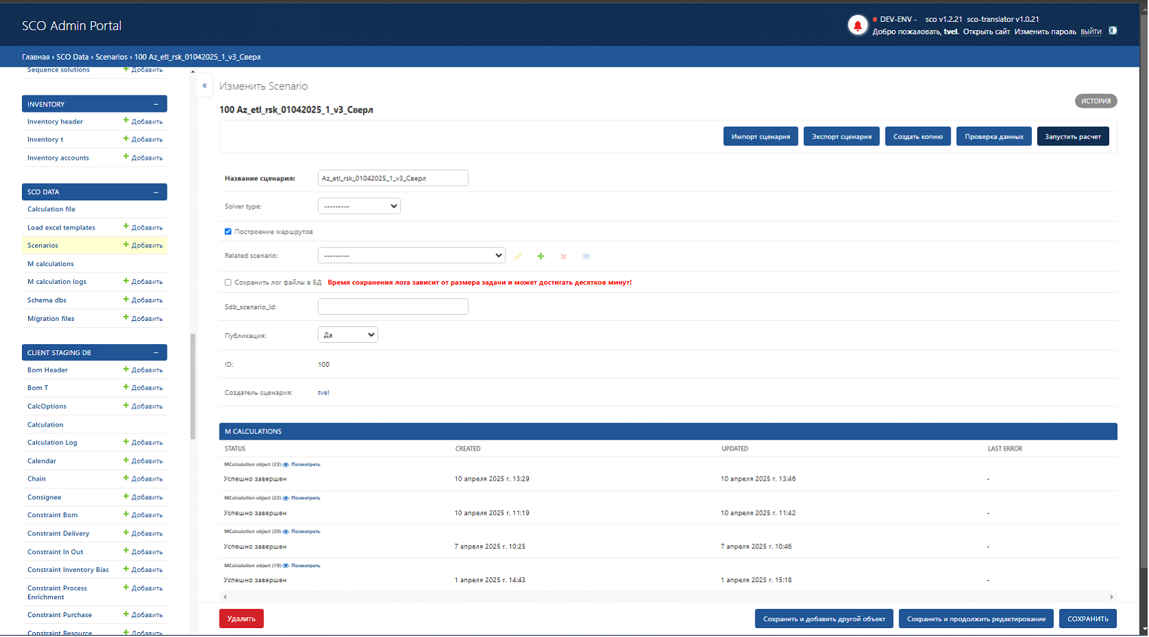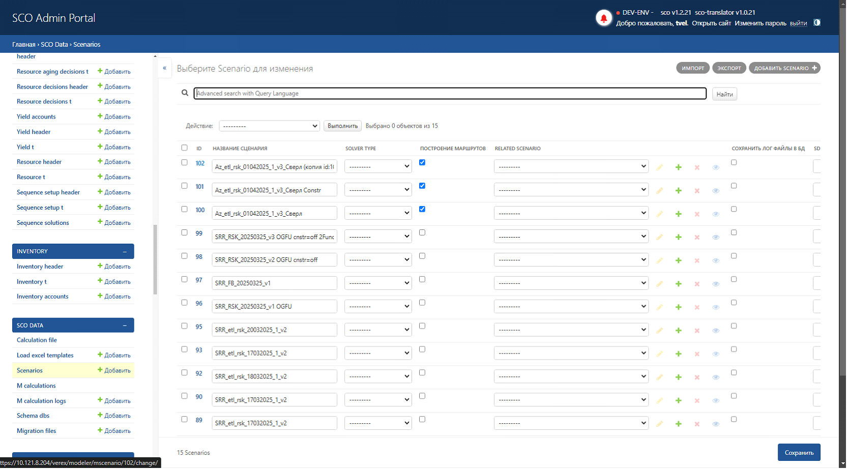 Или вручную откройте на боковой панели SCO DATA → вкладка scenarios → выберите ID своего сценария.